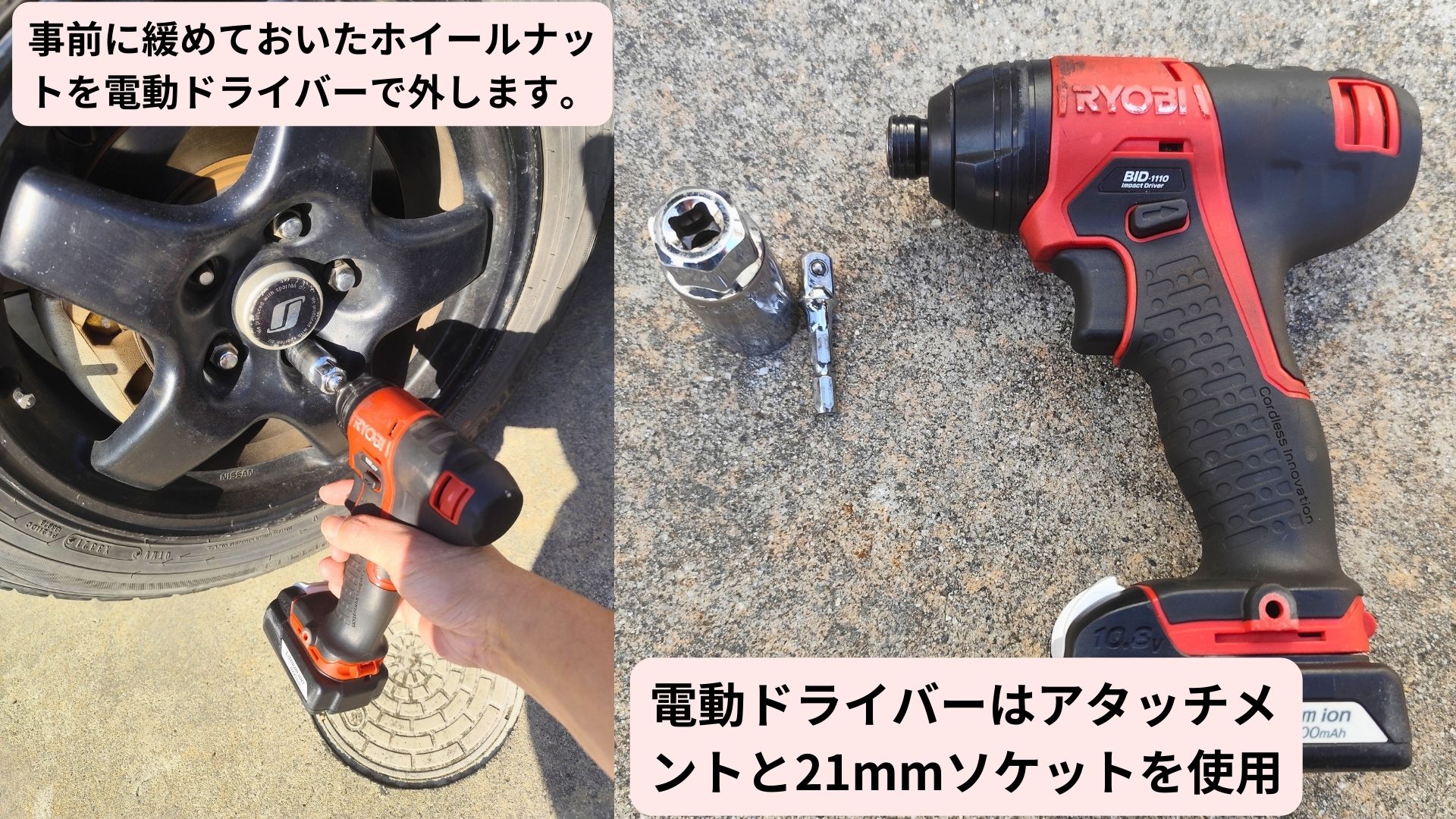 次にホイールナットを充電ドライバーで取り外します。作業時間短縮に充電ドライバーは是非お勧めです。また専用のアタッチメントと21mmソケットが必要です。一応商品リンクを貼っておきます。(但しこの充電ドライバは本締め出来る程のパワーは無いのであくまで緩んだボルトを早回しで緩める場合や仮締め等でしか使用できません。商品リンクのソケットも高トルク用ではないので本気のインパクトレンチで使用すると破損する恐れが有ります。)