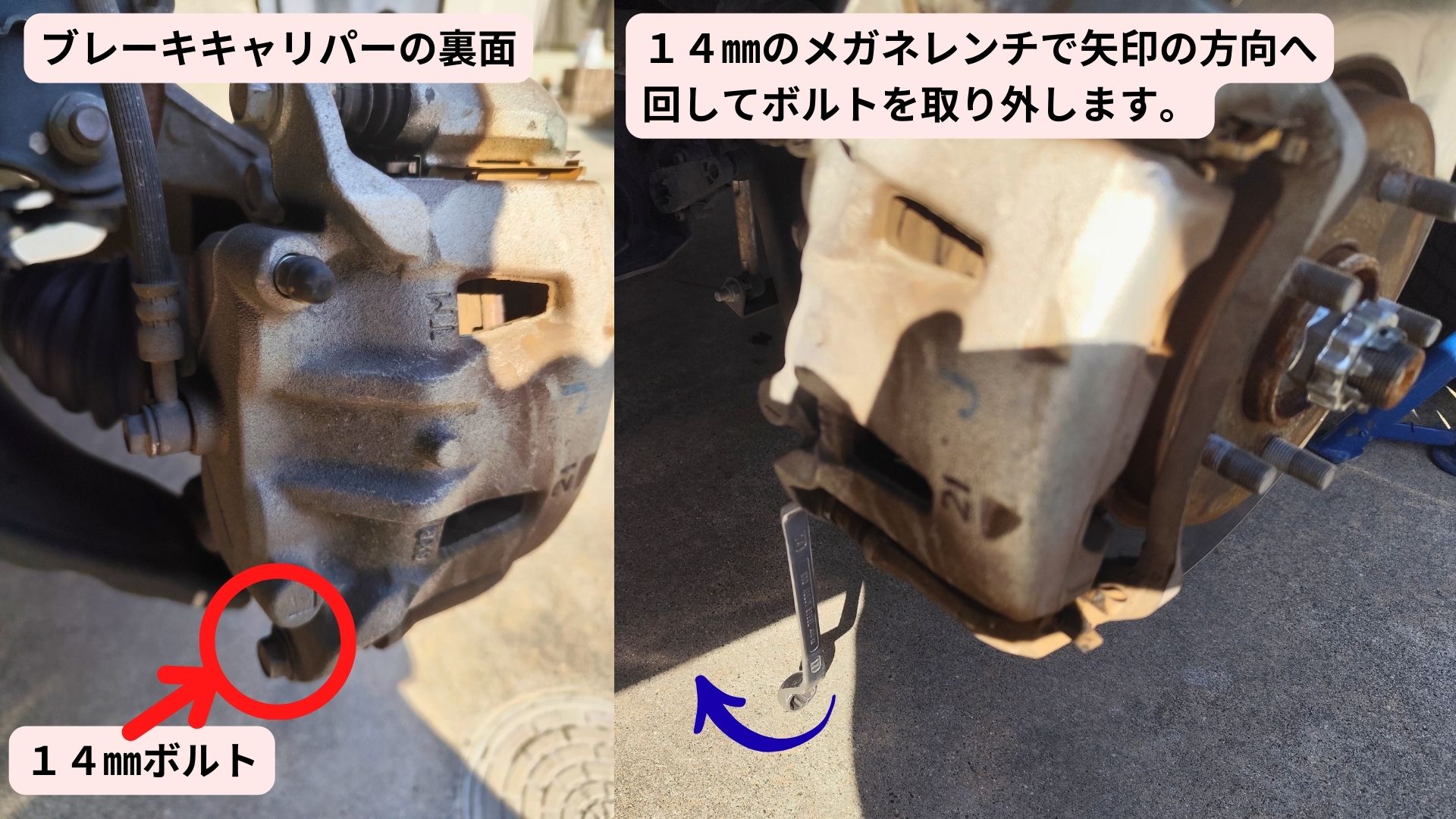 左下写真の赤丸部が14mmボルトですので右下写真の様にメガネレンチをかけて青矢印方向へ回して緩めます。(ボルトは車体外側方向へ刺さっているので緩める方向に注意しましょう)