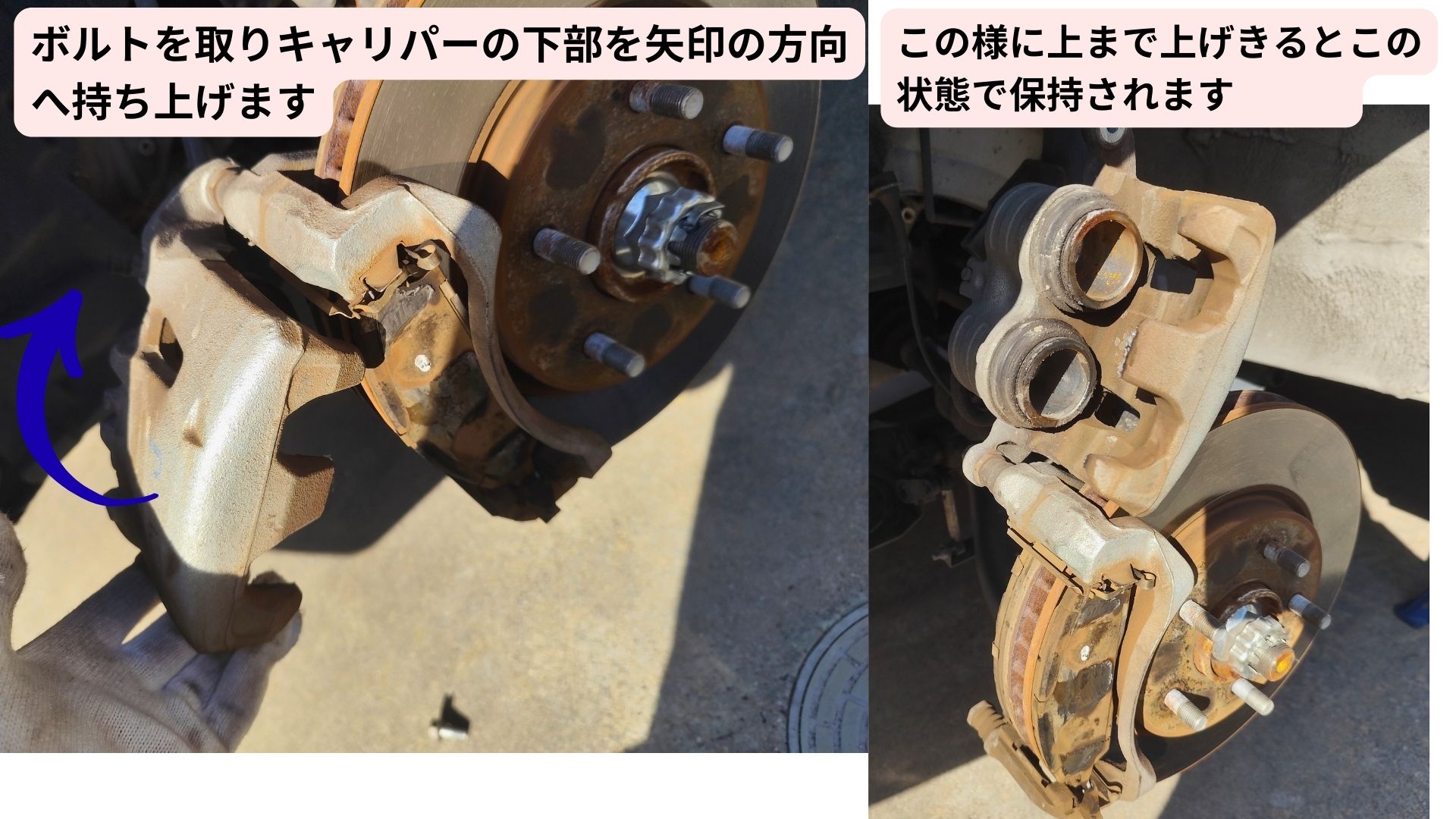 ボルトを完全に抜き取ると右下写真の様にブレーキキャリパーが持ち上がり保持することが出来ます。(車種によっては保持できない為フック等で吊り下げる場合も有ります。)