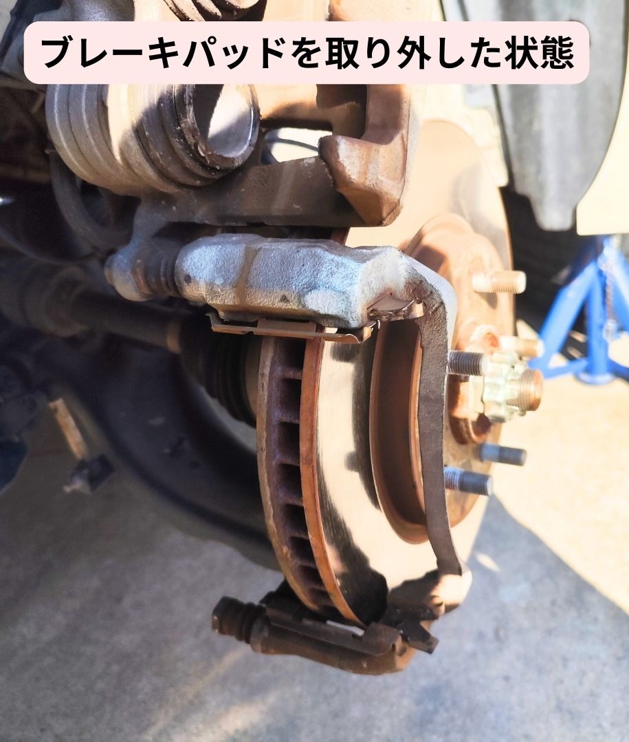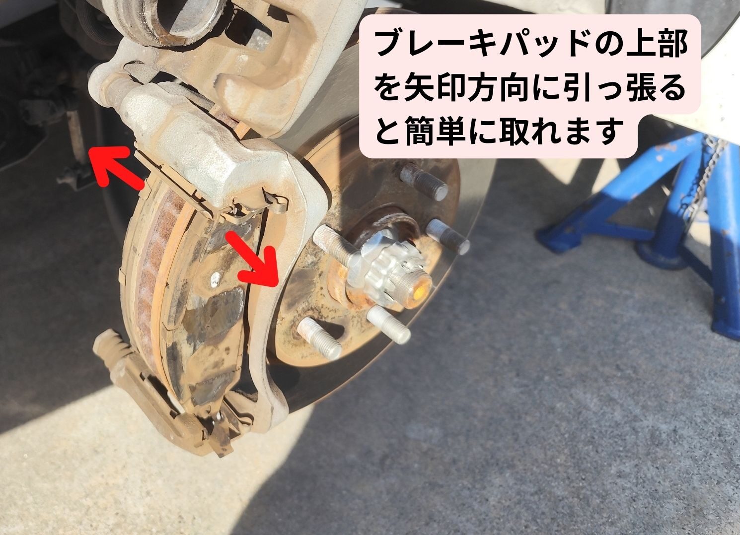 この状態でブレーキパッドは手で抜き取ることが出来ます。下写真のブレーキパッド上部を摘まみ赤矢印方向に引っ張ります。