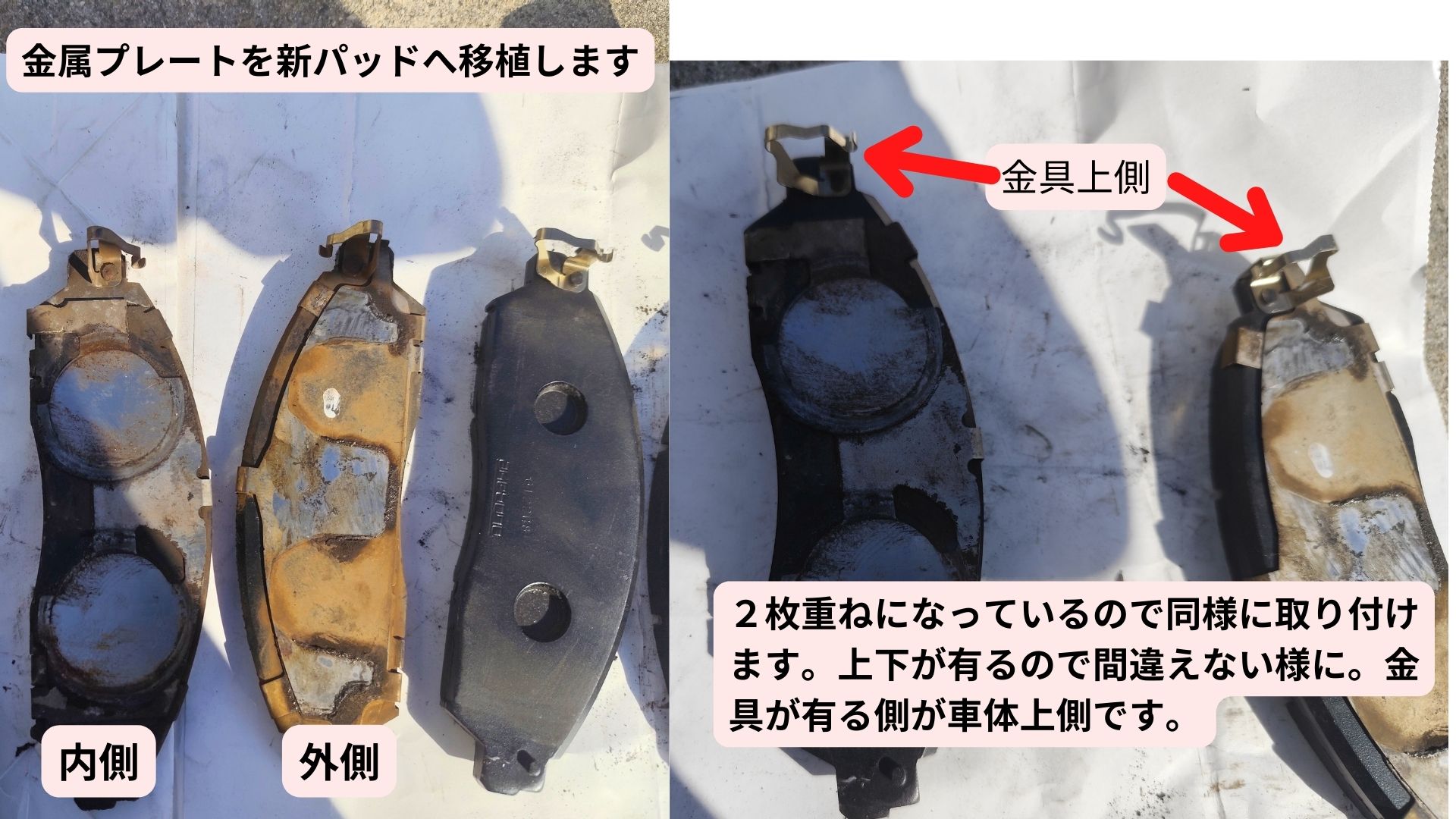次に下写真の様に旧のパッド付いている金属プレートを新品パッドに移植します。