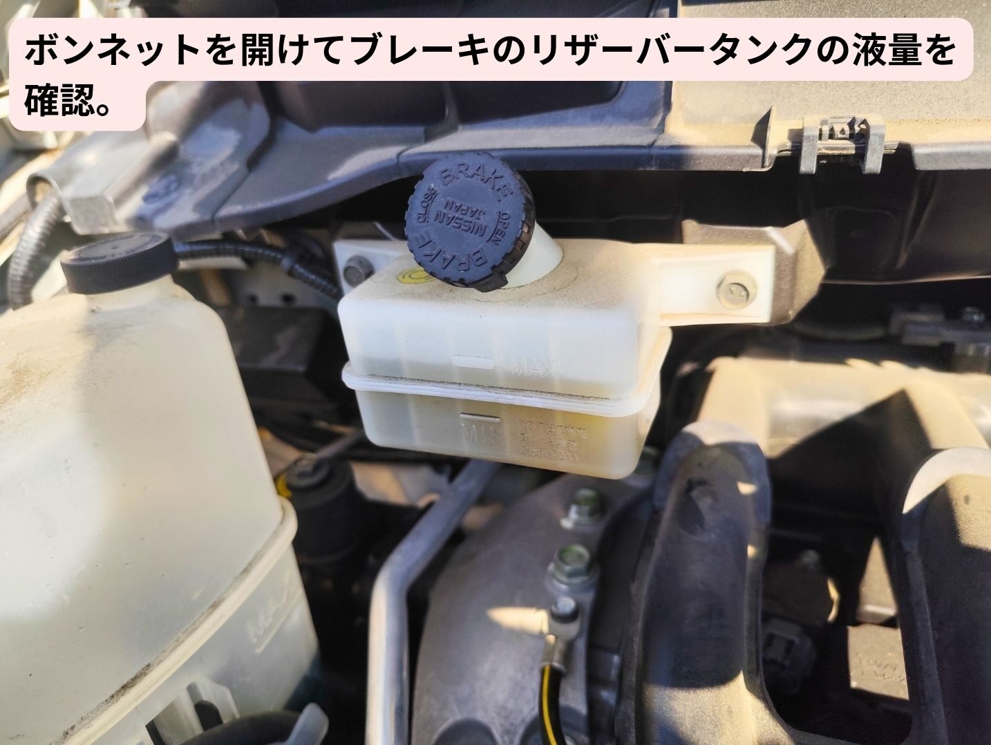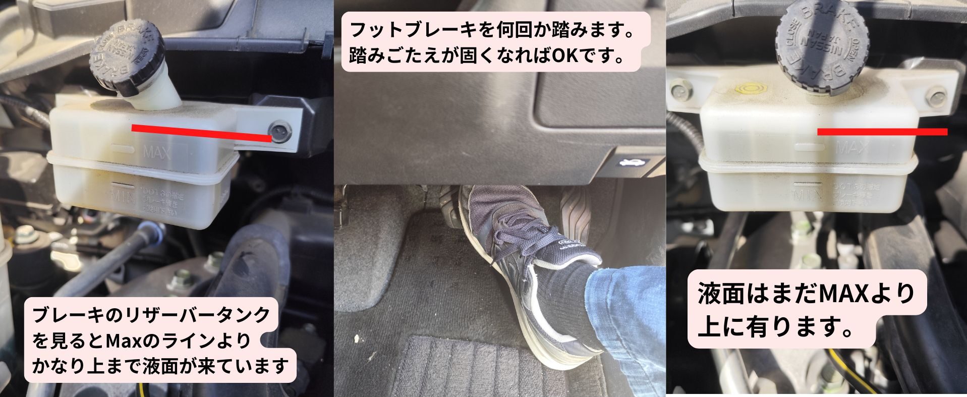 左右のブレーキパッドを取り付け出来たら下写真の様にブレーキリザーバータンクの液量を確認します。見るとMAXの線より赤色の液面が上がっています。