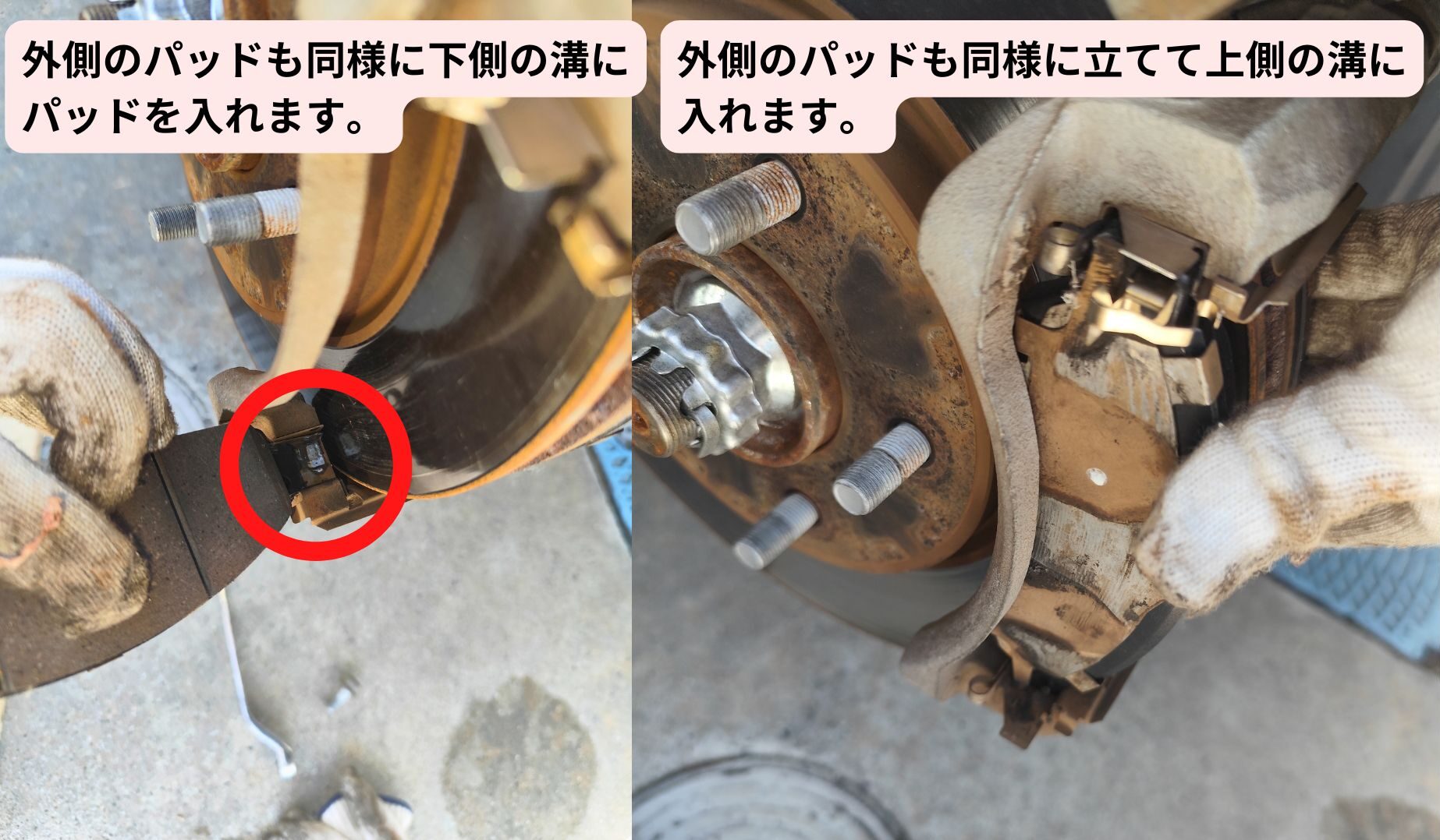 次に外側のパッドを組付けます。内側の時と同様で下写真の赤丸部へまずパッドの突起部を入れてから立てていき上部の溝に入れます。