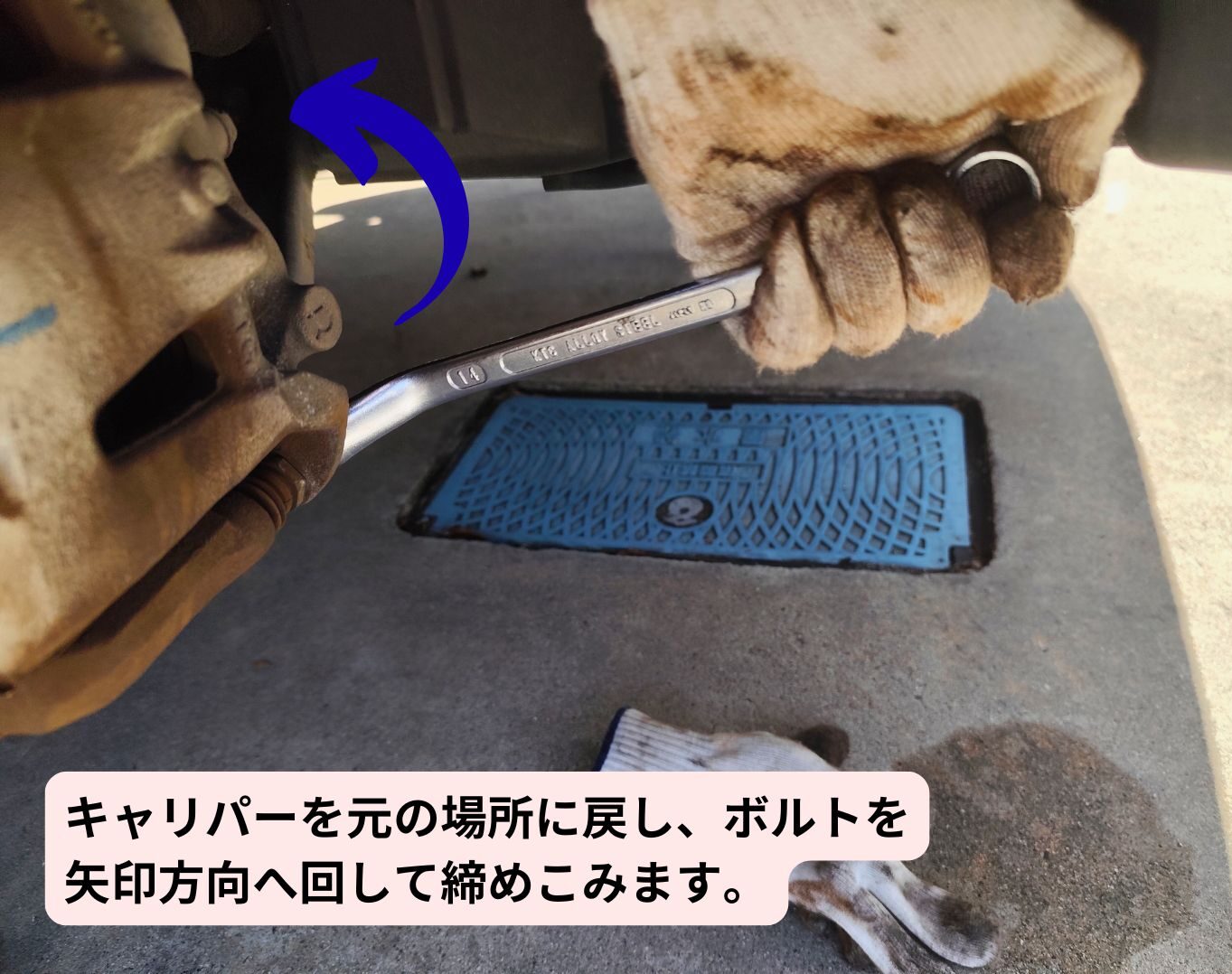 あとはブレーキキャリパーを元に戻すだけです。上に跳ね上げていたキャリパーを元の位置に戻し外したボルトを下写真の様にメガネレンチで締め込みます。締め込む強さは緩める際の固さ程度で良いです。