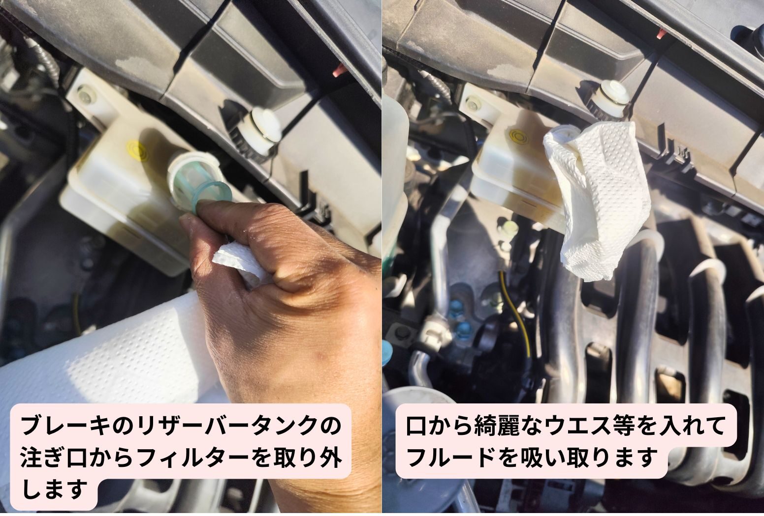 液面を下げる為にスポイト等でタンクからフルードを抜き取る方法が有りますが無かったので下写真の様に注ぎ口のフィルターを取ってから綺麗なウエス等でフルードを染み込ませます。