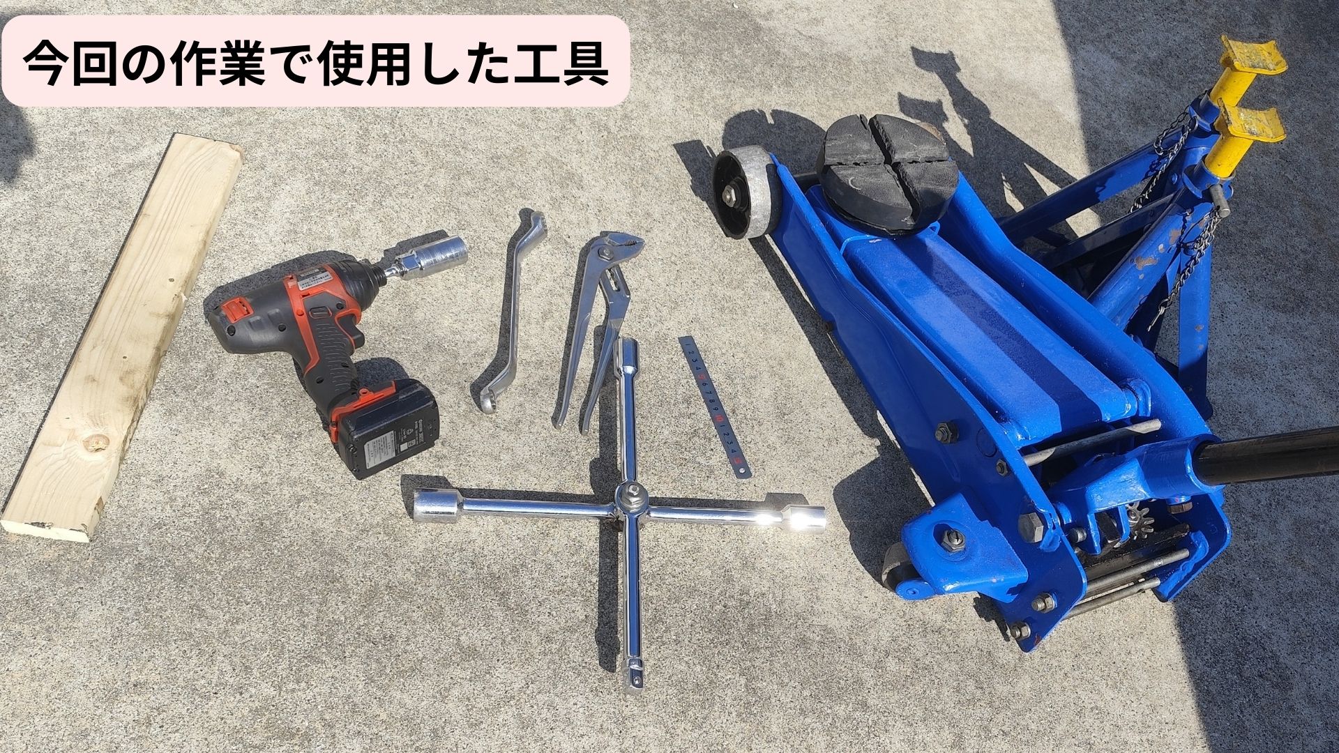 右からリジットラック2脚、ガレージジャッキ、スケール、十字レンチ、ウォーターポンププライヤ、14mmメガネレンチ、充電ドライバー、木材