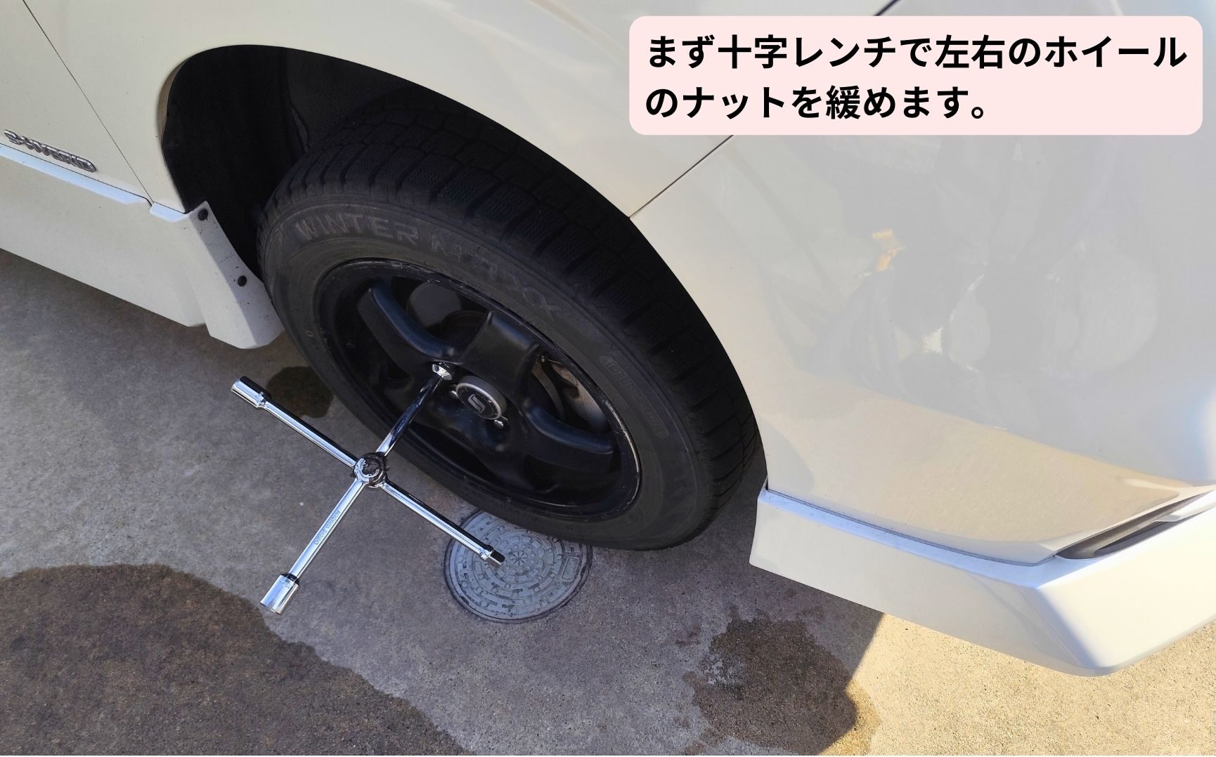 まず、ジャッキアップする前にフロントホイール左右のナットを全て少し緩めます。