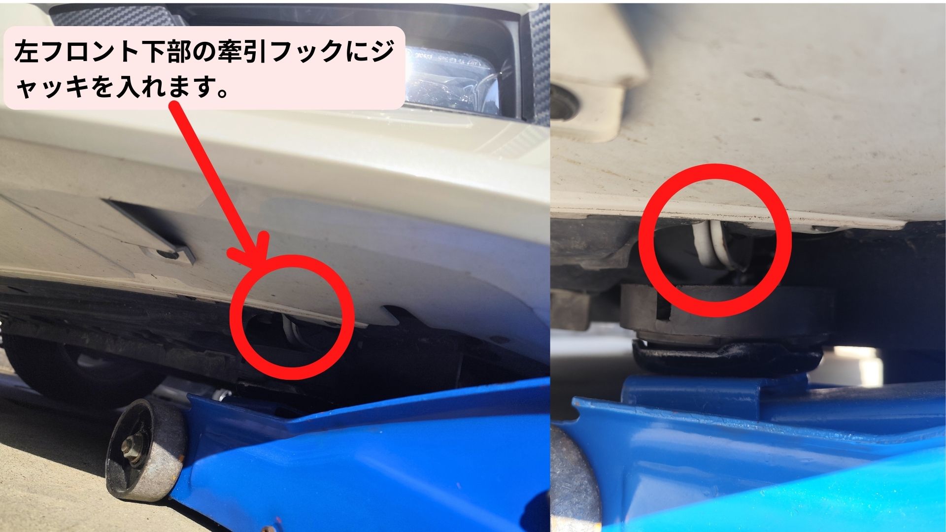下写真の赤丸部の牽引フックにジャッキをかけてジャッキアップします。