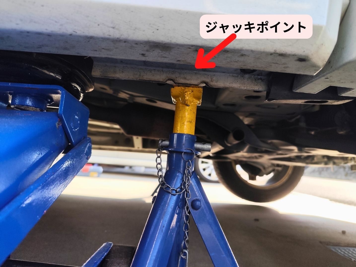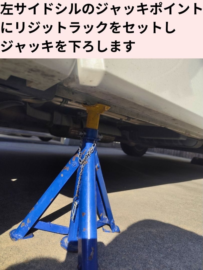 そして、リジットラックを左サイドシルのジャッキポイントへセットしジャッキを下ろします。リジットラックがちゃんとジャッキポイントに載ったか確認します。